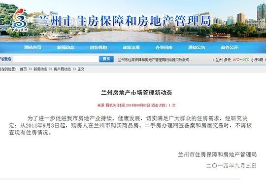 9月3日,兰州市住房保障和房地产管理局官方网站上发布《兰州房地产市场管理新动态》,该政策称,从2014年9月3日起,购房人在兰州市购买商品房、二手房办理网签备案和房屋交易时,不再核查现有住房情况。这意味着兰州执行了4年的限购令终结。